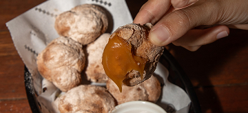 Fried dough balls dusted in cinnamon sugar with a side of warm caramel