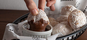 Fried dough dusted in icing sugar, with nutella and tony's hot honey on the side